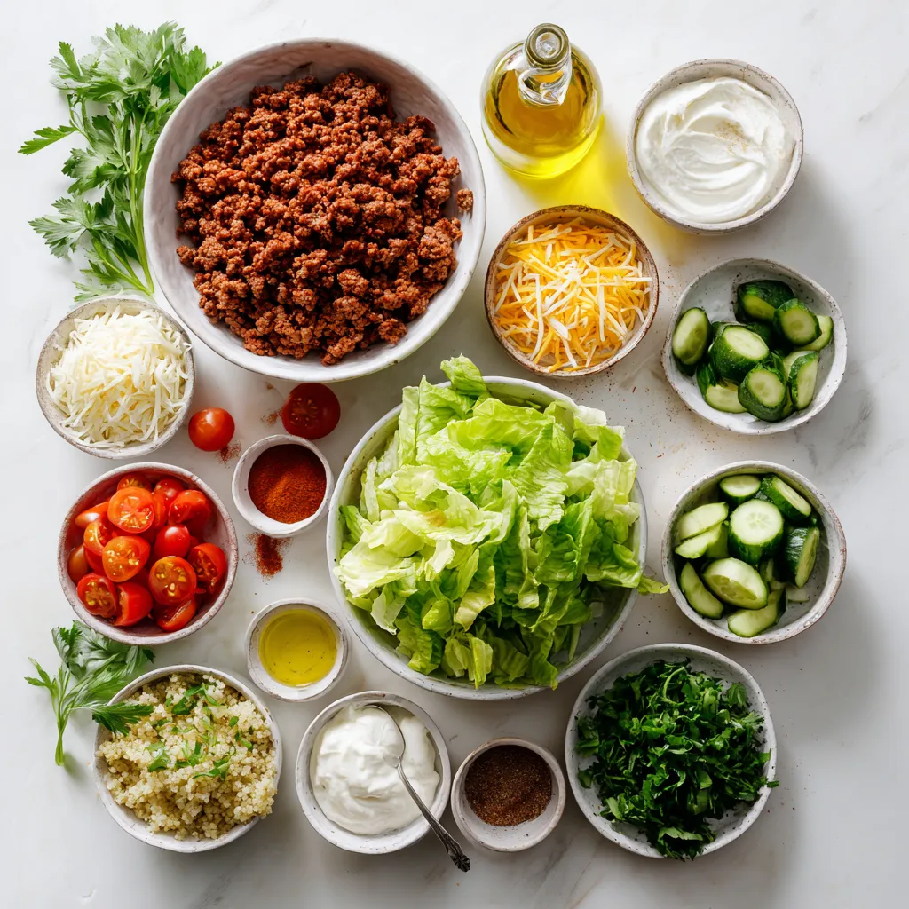 Diese Zutaten bilden die Grundlage für deine Bowls. Das Rinderhackfleisch gibt den Hauptgeschmack, während die frischen Gemüsesorten für Farbe und Crunch sorgen.