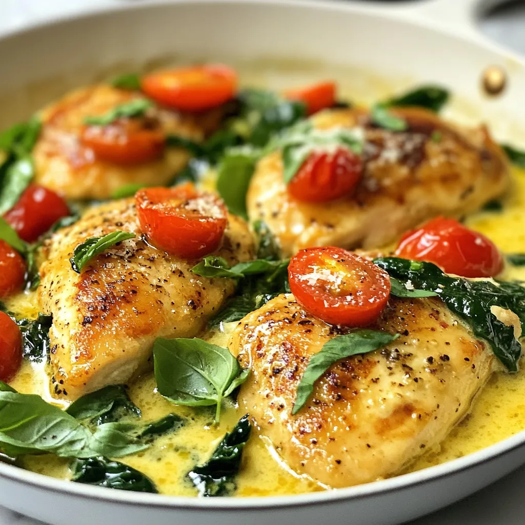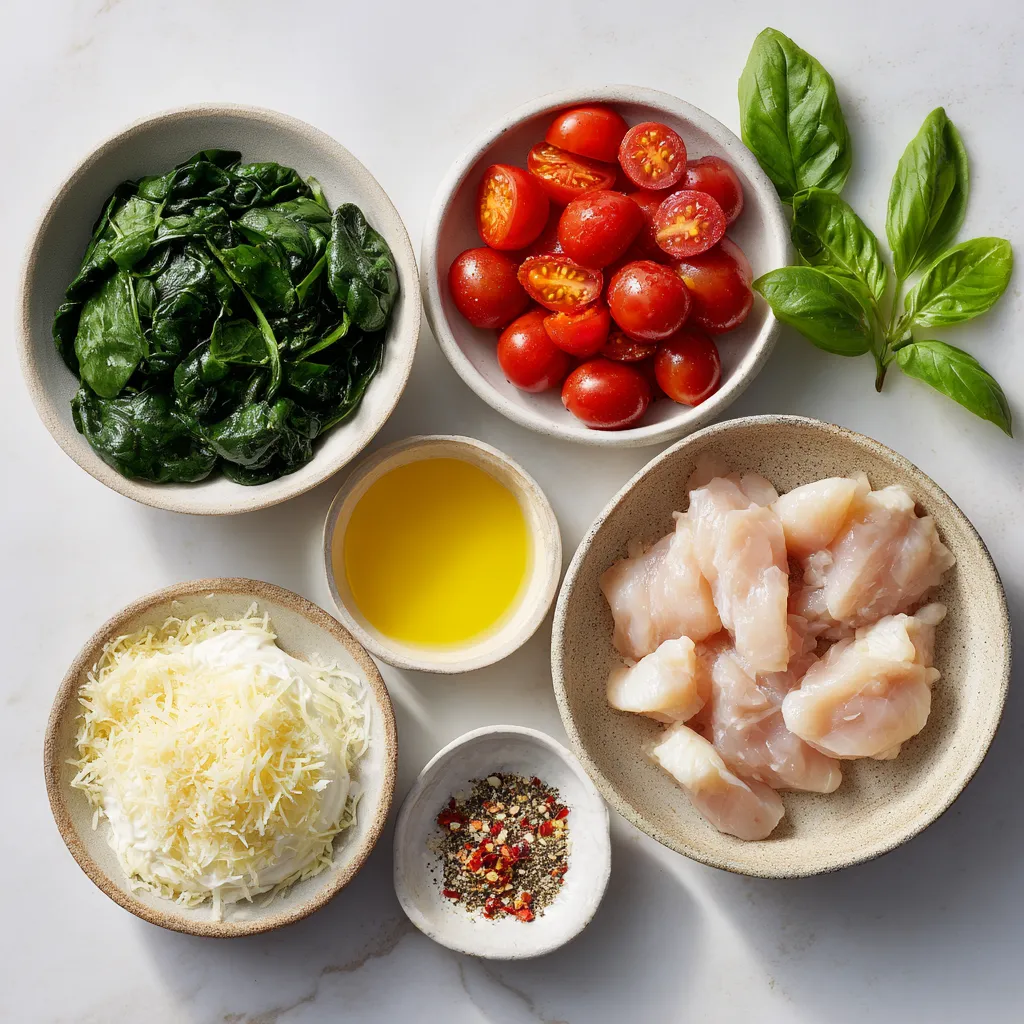Die Hauptzutaten machen das Gericht besonders schmackhaft. Hähnchenbrustfilets sind mager und zart. Sie liefern viel Protein und sind einfach zu kochen. Kirschtomaten bringen Süße und Farbe ins Spiel. Spinat fügt frische und Nährstoffe hinzu. Schlagsahne und Parmesan machen die Sauce cremig und reichhaltig.