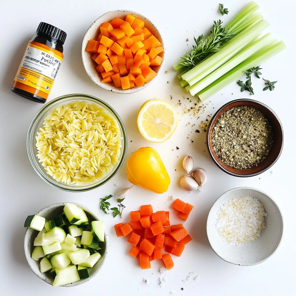 Zuerst sammeln wir alle Zutaten. Du brauchst Orzo-Nudeln, Gemüse und Gewürze. Ich schneide die Zwiebel, Karotte, Sellerie, Paprika und Zucchini in kleine Stücke. So garen sie gleichmäßig. Achte darauf, dass der Knoblauch fein gehackt ist. Das bringt viel Geschmack in die Suppe.