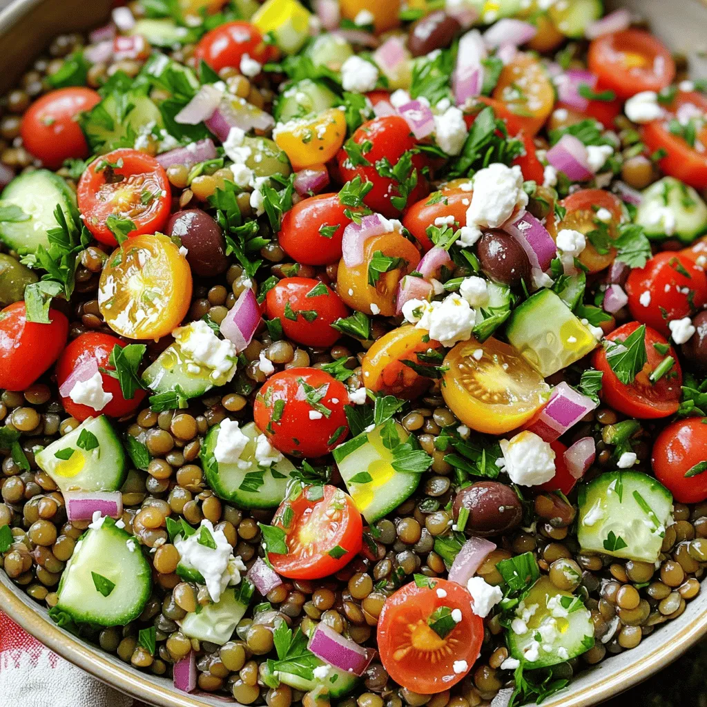 Kalamata-Oliven fügen eine salzige Note hinzu, die super zu den Linsen passt. Feta-Käse bringt einen cremigen, salzigen Geschmack. Ich mag es, frische Petersilie zu nutzen, um dem Salat ein schönes Aroma zu verleihen. Würzen Sie ihn mit Salz und Pfeffer nach Ihrem Geschmack.