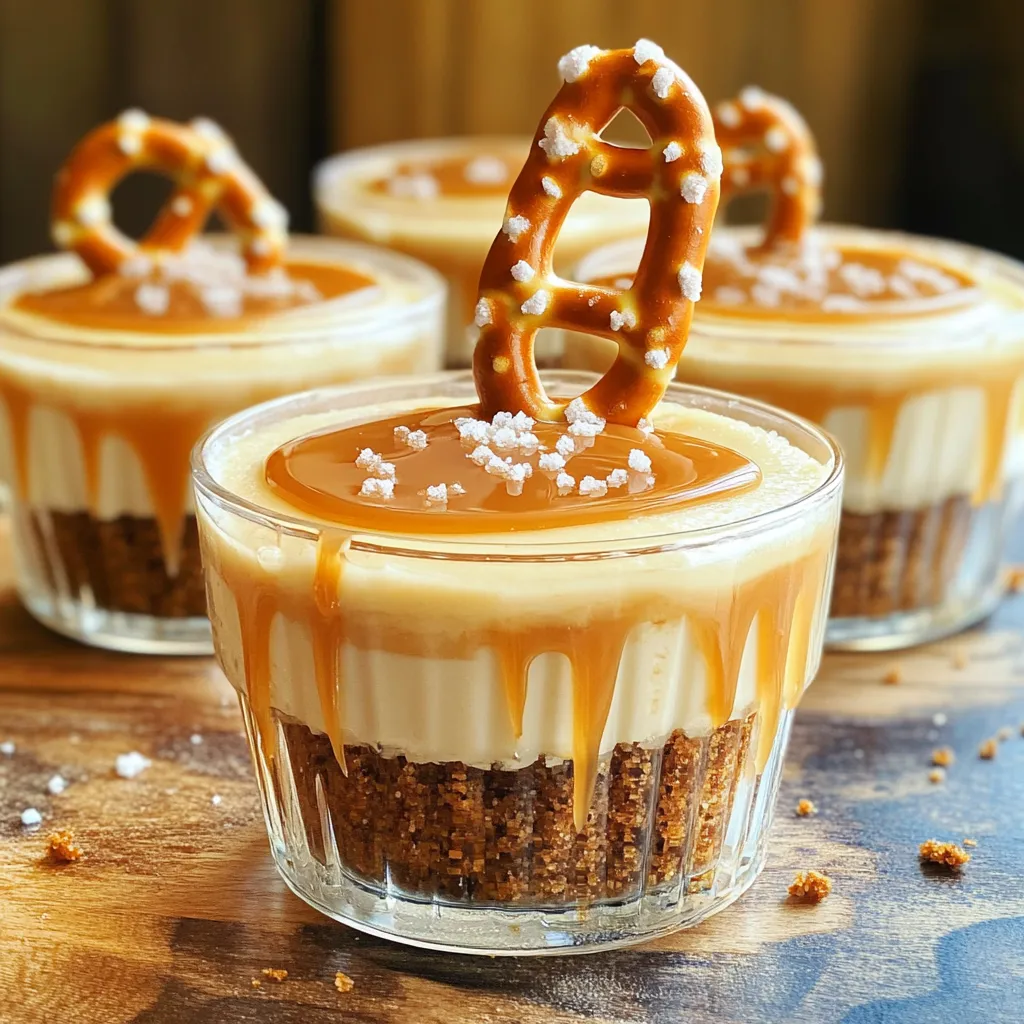 Diese Dessertcups sind perfekt für Partys. Du kannst sie bis zu zwei Tage im Voraus zubereiten. Schichte die Brezelkruste und Käsekuchenfüllung, aber füge die Karamellsauce und das Meersalz erst kurz vor dem Servieren hinzu. So bleiben die Cups frisch und die Kruste knusprig. Bereite auch einige extra Brezeln für die Dekoration vor, damit sie toll aussehen!