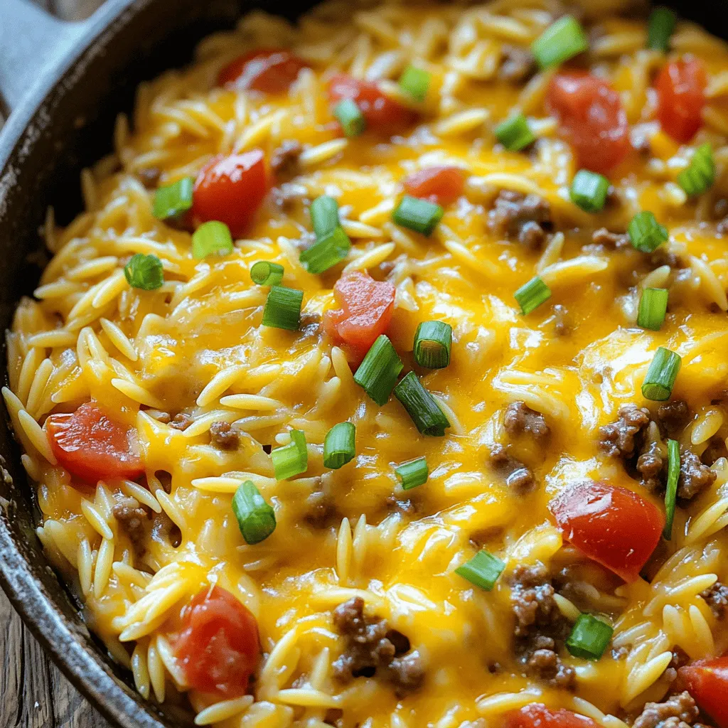 ![- 1 Esslöffel Olivenöl - 1 Zwiebel, gewürfelt - 450 g Rinderhackfleisch oder Putenhackfleisch - 240 g ungekochte Orzo-Nudeln Die Hauptzutaten machen dieses Gericht besonders. Das Olivenöl gibt Geschmack und hilft beim Braten. Die Zwiebel sorgt für Aroma und Süße. Du kannst Rinderhackfleisch oder Putenhackfleisch verwenden. Beide Optionen sind schmackhaft und bieten viel Protein. Die Orzo-Nudeln sind eine tolle Alternative zu Reis oder Pasta. Sie nehmen die Aromen der anderen Zutaten gut auf. - 480 ml Rinderbrühe - 1 Esslöffel Worcestershiresauce - 240 g gewürfelte Tomaten Flüssige Zutaten sind wichtig, um das Gericht saftig zu machen. Die Rinderbrühe bringt Tiefe und Geschmack. Worcestershiresauce fügt einen kräftigen, umami Geschmack hinzu. Die gewürfelten Tomaten bringen Frische und etwas Säure. Diese Kombination macht das Gericht lecker und aromatisch. - 2 Teelöffel Senf - 120 g geriebener Cheddarkäse - Salz und Pfeffer nach Geschmack Gewürze und Käse runden das Gericht ab. Senf bringt eine leichte Schärfe und Tiefe. Der geriebene Cheddarkäse macht alles cremig und herzhaft. Mit Salz und Pfeffer passt du die Aromen perfekt an. Die richtige Mischung macht den Unterschied in deinem One-Pot Cheeseburger Orzo Skillet. Für die vollständige Anleitung und Zubereitung, schau dir das Rezept [Full Recipe]. - Zwiebel und Knoblauch vorbereiten - Gemüse und Hackfleisch bereitstellen Zuerst schneide die Zwiebel in kleine Stücke. So wird sie schnell weich. Hacke auch den Knoblauch fein. Diese beiden Zutaten geben dem Gericht viel Geschmack. Bereite dann das Gemüse und das Hackfleisch vor. Das Rinderhackfleisch ist eine gute Wahl. Du kannst aber auch Putenhackfleisch nutzen, wenn du etwas Leichteres willst. - Erhitze das Olivenöl und dünste die Zwiebel - Füge Knoblauch und Hackfleisch hinzu - Mixe die Orzo und Brühe ein Erhitze einen Esslöffel Olivenöl in einer großen Pfanne. Füge die Zwiebel hinzu und dünste sie. Sie sollte glasig werden, das dauert etwa 3 bis 4 Minuten. Jetzt kommt der Knoblauch dazu. Brate ihn eine Minute lang an, bis er gut duftet. Dann gib das Hackfleisch in die Pfanne. Brate es an, bis es braun ist. Das dauert etwa 5 bis 7 Minuten. Wenn das Fleisch fertig ist, gieß überschüssiges Fett ab. Jetzt ist es Zeit für die Orzo-Nudeln. Füge sie zusammen mit der Rinderbrühe, den gewürfelten Tomaten, Worcestershiresauce und Senf in die Pfanne. Rühre alles gut um und bringe die Mischung zum Kochen. - Zum Kochen bringen und köcheln lassen - Cheddar unterrühren und servieren Sobald die Mischung kocht, reduziere die Hitze. Decke die Pfanne ab und lasse alles 10 bis 12 Minuten köcheln. Rühre zwischendurch um, damit nichts anklebt. Die Orzo sollte al dente sein und die Brühe fast ganz aufgenommen haben. Nimm die Pfanne vom Herd. Jetzt kommt der leckerste Teil: Rühre den geriebenen Cheddar ein. Er schmilzt und macht das Gericht cremig. Schmecke es mit Salz und Pfeffer ab. Serviere das Gericht warm. Garniere es mit gehackten Frühlingszwiebeln für einen frischen Akzent. Du findest die vollständige Zubereitung in der [Full Recipe]. Für eine leichtere Variante empfehle ich, mageres Putenhackfleisch zu verwenden. Es hat weniger Fett, schmeckt aber trotzdem gut. Du kannst auch verschiedene Käsesorten ausprobieren. Cheddar ist großartig, aber Gruyère oder Mozzarella bringen einen anderen Geschmack. Beim Kochen der Orzo-Nudeln ist es wichtig, sie nicht zu überkochen. Sie sollten al dente bleiben. Rühre die Nudeln regelmäßig um, um ein Ankleben zu vermeiden. Wenn du sie anbrätst, bevor du die Brühe hinzufügst, kannst du noch mehr Geschmack erzielen. Garnituren machen das Gericht lebendig. Frische Frühlingszwiebeln passen perfekt dazu. Du kannst auch einen Klecks Sauerrahm oder etwas frische Petersilie darüber geben. Serviere das Gericht in tiefen Tellern, damit die Soße gut zur Geltung kommt. Für das vollständige Rezept, siehe [Full Recipe]. {{image_4}} Wenn du eine vegetarische Version der One-Pot Cheeseburger Orzo Pfanne machen möchtest, kannst du pflanzliches Hackfleisch verwenden. Alternativ sind Linsen auch eine tolle Wahl. Sie sind nahrhaft und fügen Textur hinzu. Du kannst die gleiche Menge Linsen wie Rinderhack verwenden. Koche die Linsen einfach nach Packungsanweisung, bevor du sie hinzufügst. So erhältst du ein herzhaftes, fleischfreies Gericht. Um deinem Gericht einen extra Kick zu geben, probiere verschiedene Gewürze. Füge scharfe Saucen wie Sriracha oder Tabasco hinzu, wenn du es schärfer magst. Auch ein Hauch von Paprika oder Cayennepfeffer kann den Geschmack vertiefen. Experimentiere mit italienischen Kräutern wie Oregano oder Basilikum für eine andere Geschmacksrichtung. Die Möglichkeiten sind endlos! Die One-Pot Pfanne ist sehr sättigend, aber du kannst sie auch mit Beilagen erweitern. Ein frischer grüner Salat passt gut dazu. Auch knuspriges Brot oder Brötchen sind eine tolle Ergänzung. Wenn du mehr Gemüse möchtest, serviere gedämpfte Brokkoli- oder Karottenstücke. Diese Beilagen runden das Gericht ab und machen es noch vielfältiger. Um die Reste von One-Pot Cheeseburger Orzo Skillet zu lagern, stelle sicher, dass sie abgekühlt sind. Fülle das Gericht in einen luftdichten Behälter. - Kühlen im Kühlschrank: Du kannst die Reste bis zu vier Tage im Kühlschrank aufbewahren. Achte darauf, dass der Behälter gut verschlossen ist. - Einfrieren des Gerichts: Wenn du das Gericht länger aufbewahren möchtest, friere es ein. Verwende dafür einen gefrierfesten Behälter oder Gefrierbeutel. Die Haltbarkeit hängt von der Lagerung ab. Hier sind einige Tipps: - Tipps zur Haltbarkeit im Kühlschrank: Halte die Temperatur deines Kühlschranks bei 4 °C oder darunter. So bleibt das Gericht frisch. - Optimale Lagerbedingungen für gefrorene Portionen: Lagere gefrorene Portionen bei -18 °C. So bleibt der Geschmack und die Textur erhalten. Wenn du das Gericht wieder warm machen möchtest, gibt es einfache Meth