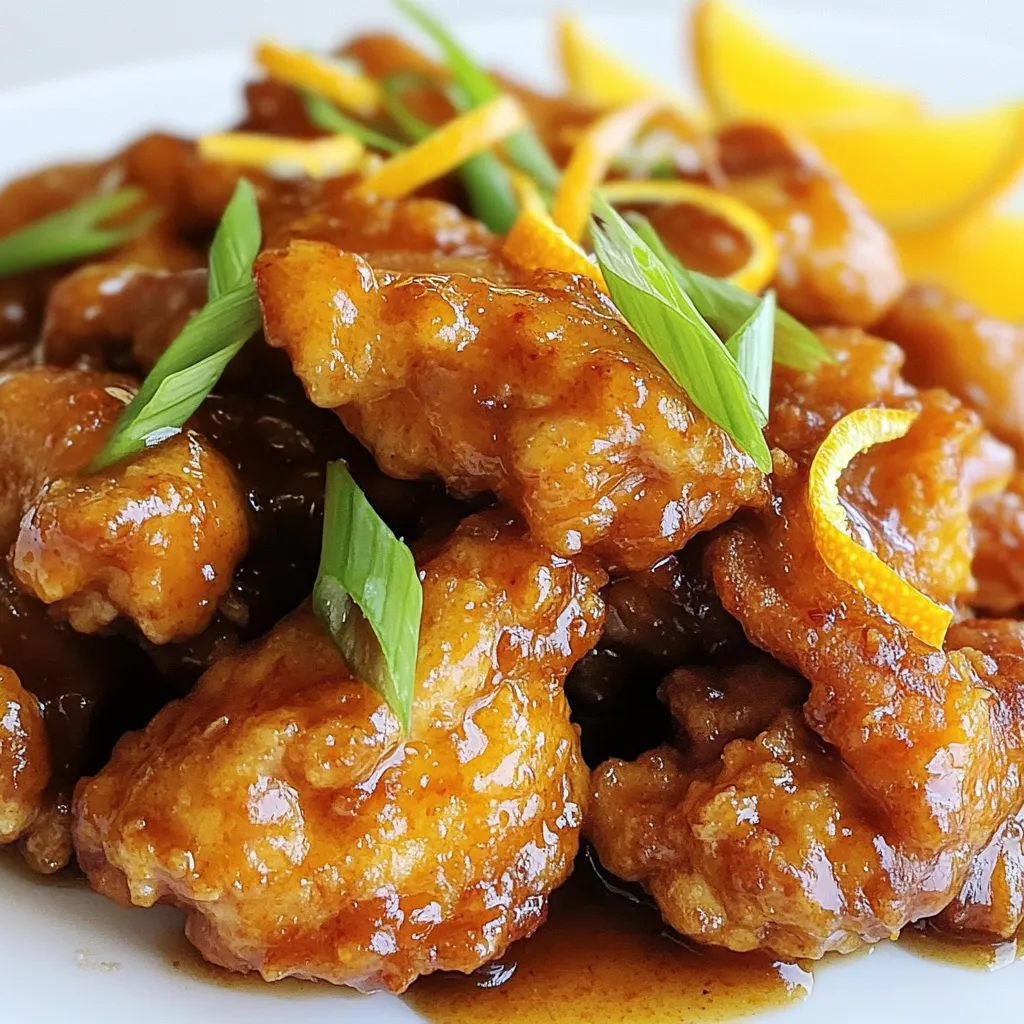 Servieren: Das Orangensüße Hähnchen auf eine Servierplatte geben und nach Belieben mit frischen, in Ringe geschnittenen Frühlingszwiebeln oder zusätzlichem Orangenschalenabrieb garnieren.