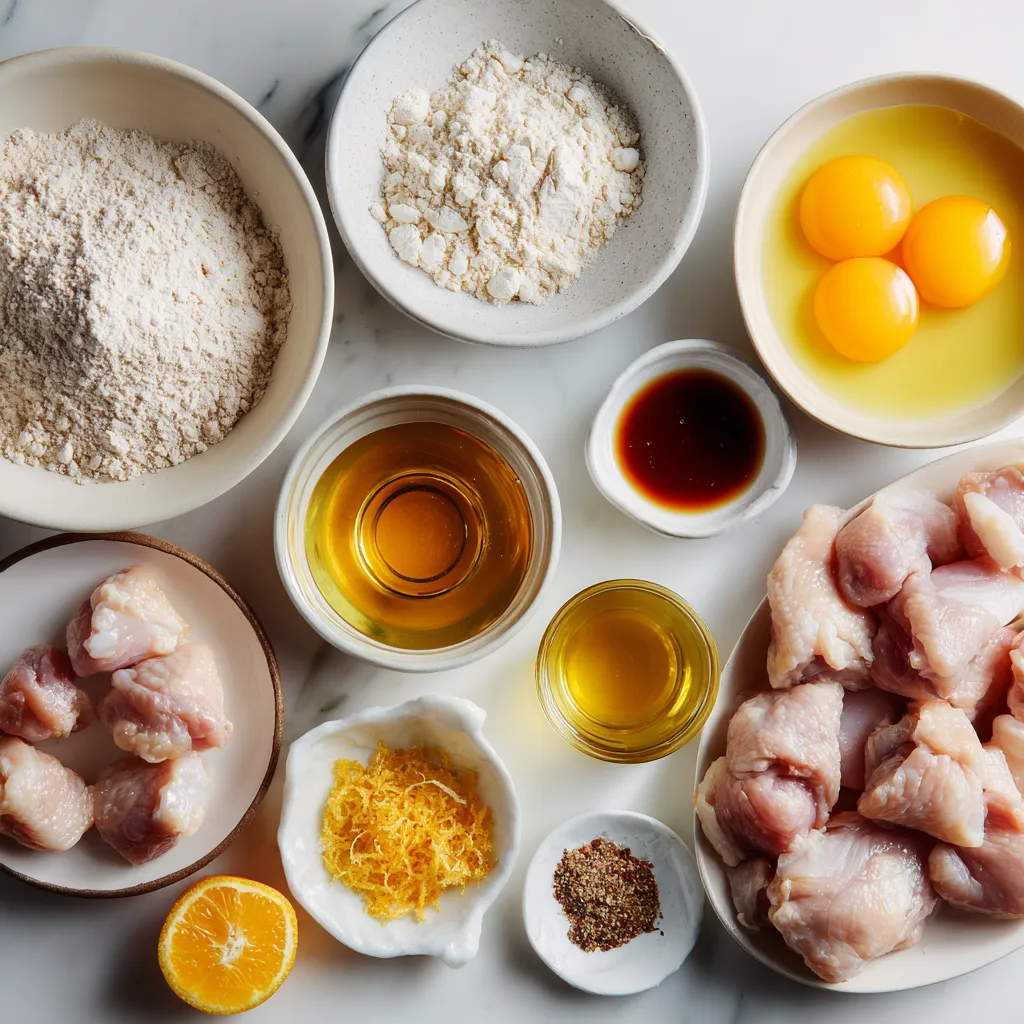 Zuerst bereite ich das Hähnchen vor. Ich schneide 450 g Hähnchenoberkeulen in mundgerechte Stücke. In einer großen Schüssel vermische ich 120 g Allzweckmehl, 65 g Speisestärke, 1 Teelöffel Salz, 1 Teelöffel Pfeffer, 1/2 Teelöffel Knoblauchpulver und 1/2 Teelöffel Ingwerpulver. In einer anderen Schüssel verquirle ich 2 große Eier. Jedes Hähnchenstück tauche ich zuerst in die Eier und dann in die Mehlmischung. So stelle ich sicher, dass alle Seiten gut bedeckt sind.