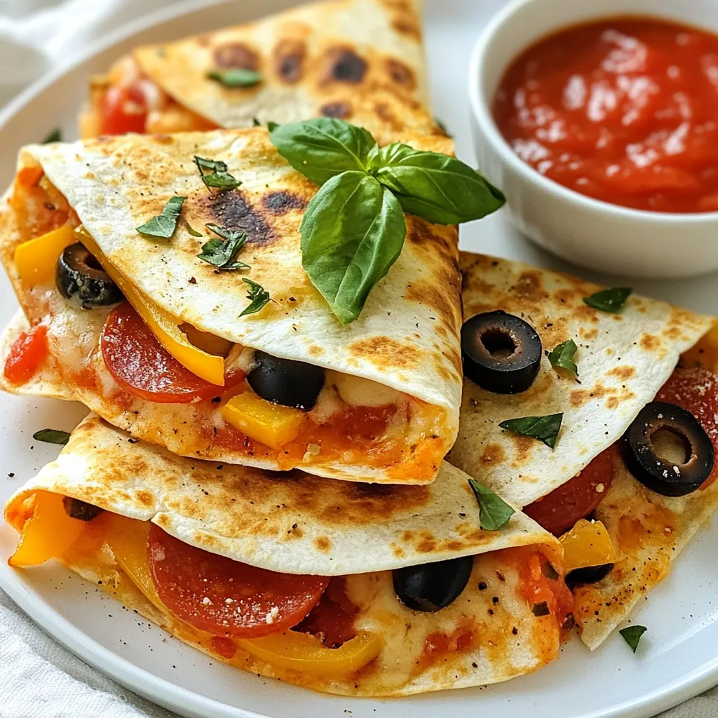 Serviere die Pizza Quesadillas warm. Du kannst sie mit extra Marinara-Soße zum Dippen anbieten.