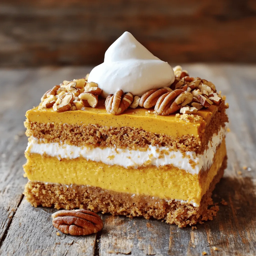 Servieren Sie den Kürbis Crunch Kuchen warm oder bei Raumtemperatur mit einem Klecks Schlagsahne obendrauf.