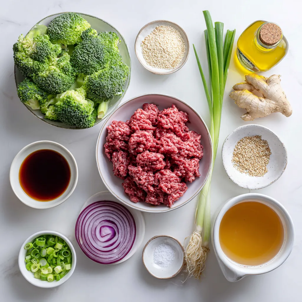 Diese Zutaten bringen Geschmack und Nährstoffe in das Gericht. Das Rinderhackfleisch gibt Ihnen eine gute Proteinquelle. Brokkoli liefert Vitamine und Ballaststoffe. Die Zwiebel, der Knoblauch und der Ingwer sorgen für ein tolles Aroma.