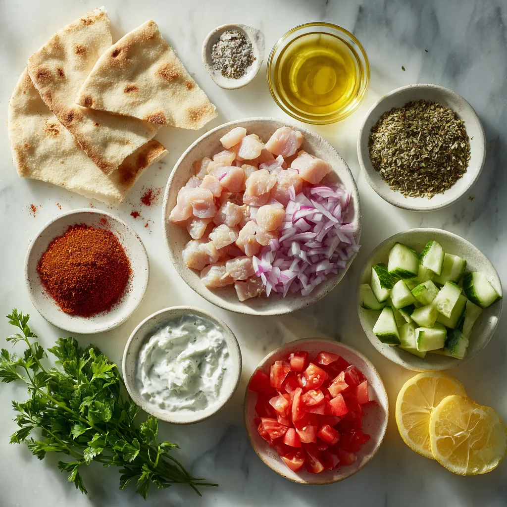 Diese Zutaten bilden die Basis für deinen Gyros. Hähnchenschenkel sind saftig und zart. Pita-Brote sind perfekt zum Einwickeln.