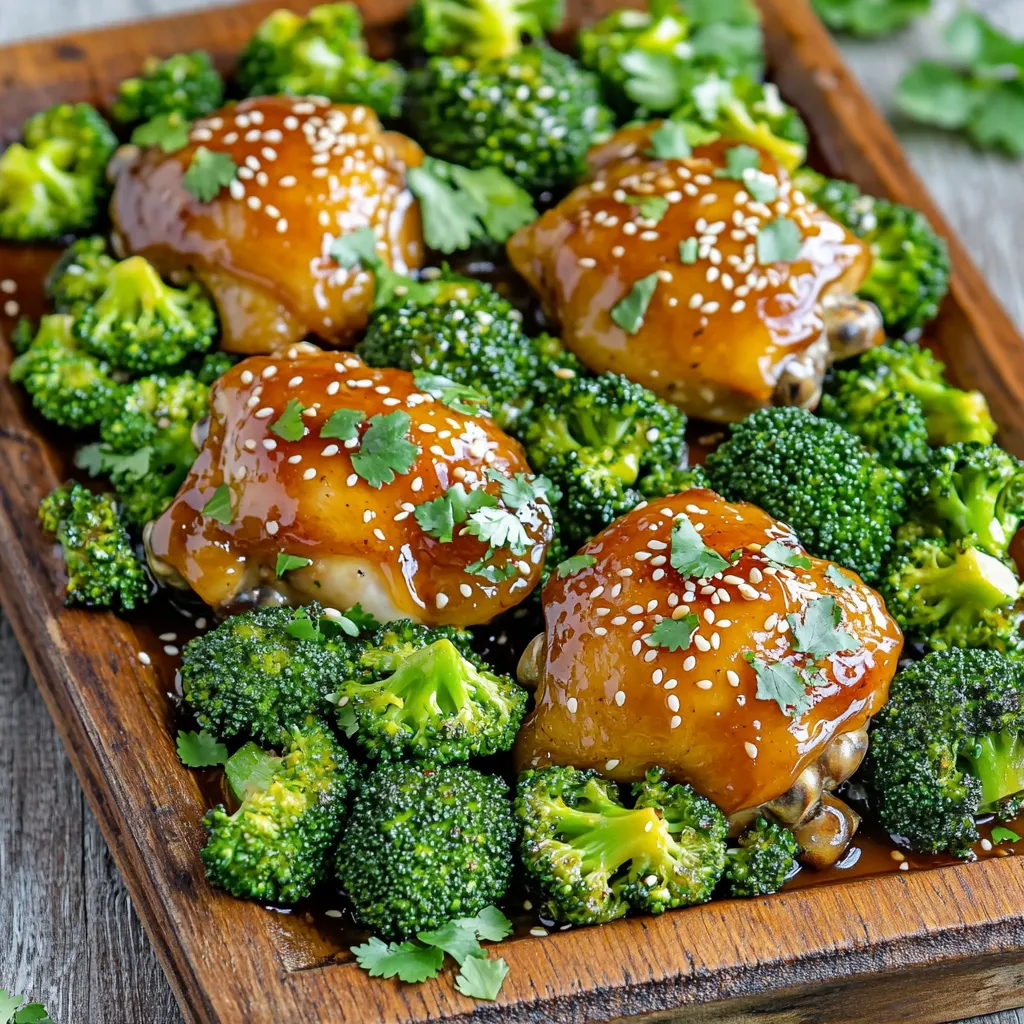 Auf der anderen Seite des Blechs fügen Sie die Brokkoliröschen hinzu. Beträufeln Sie den Brokkoli mit der restlichen Honig-Knoblauch-Mischung. Vermengen Sie alles gut. Jetzt kommt das Blech in den vorgeheizten Ofen. Backen Sie das Gericht für 20-25 Minuten. Das Hähnchen sollte eine Innentemperatur von 74°C erreichen. Der Brokkoli wird zart und leicht knusprig. Nach dem Backen lassen Sie das Hähnchen 5 Minuten ruhen. Bestreuen Sie alles mit Sesamsamen und gehacktem Koriander für mehr Farbe und Geschmack.