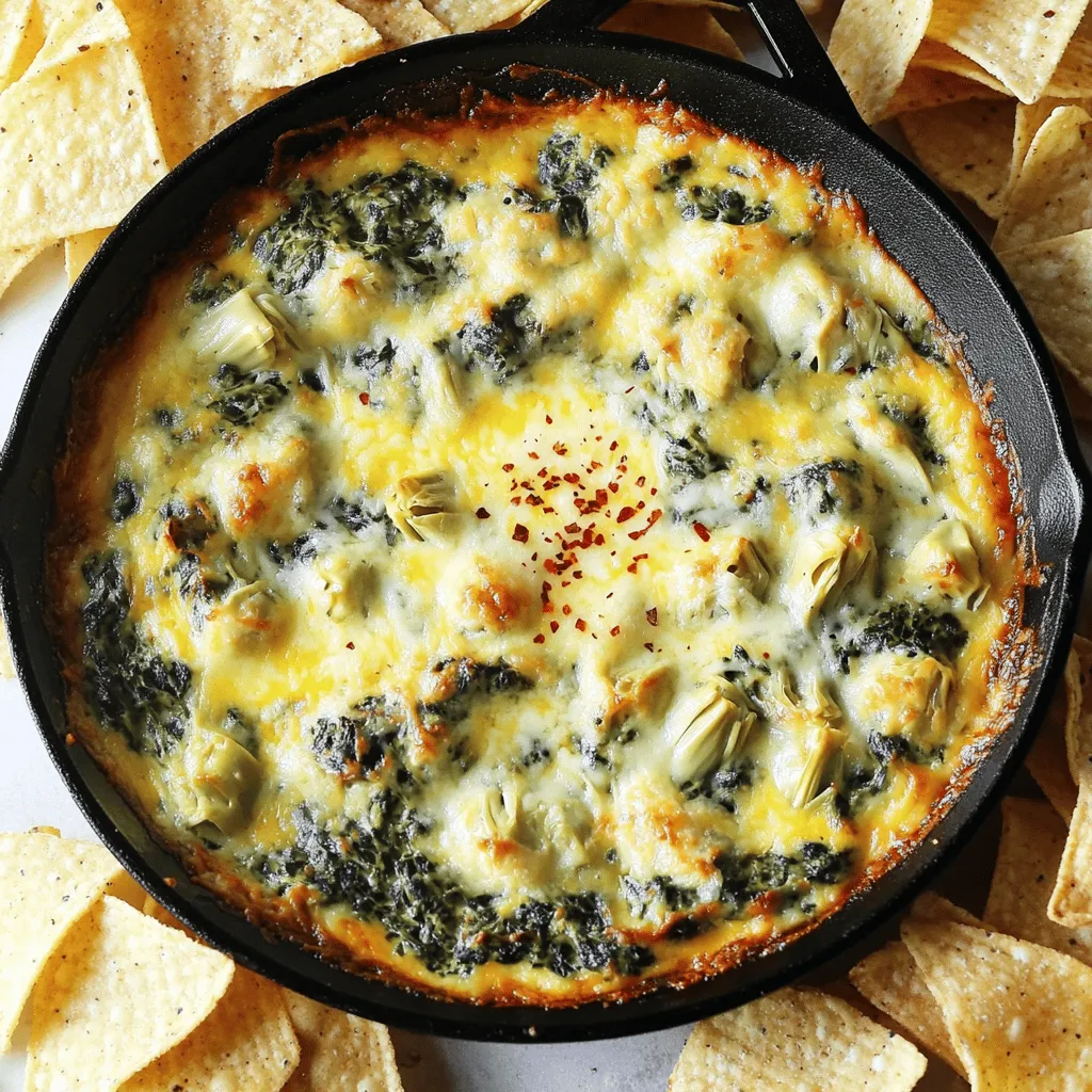 - Präsentationstipps: Serviere den Dip warm direkt aus der Pfanne. Umgebe ihn mit in Scheiben geschnittenem Baguette oder Tortilla-Chips für einfaches Dippen. Garniere mit zusätzlichem gehacktem Spinat oder einem Hauch roter Pfefferflocken für einen schönen Farbtupfer.