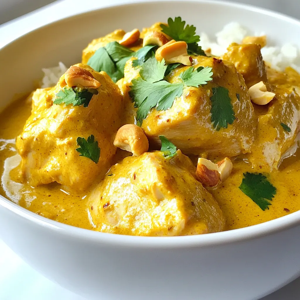 Ein reichhaltiges und aromatisches Hühnchen Korma, das langsam gekocht wird, um zarte Aromen zu entfalten.