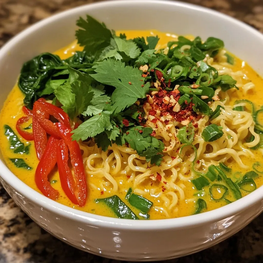 Ein schmackhaftes und würziges Ramen-Gericht mit Kokosmilch und frischem Gemüse.