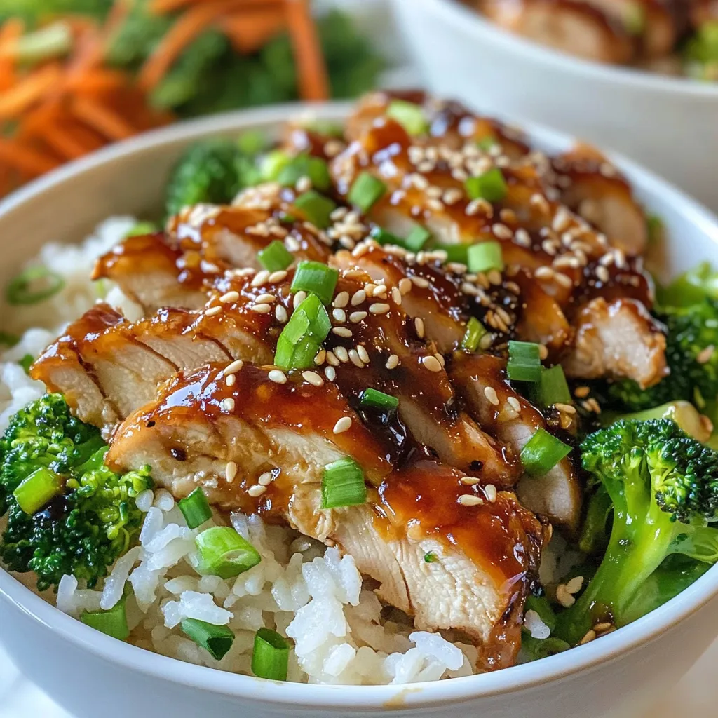 Eine köstliche und aromatische Reisbowl mit süßem Hähnchen und frischem Gemüse.