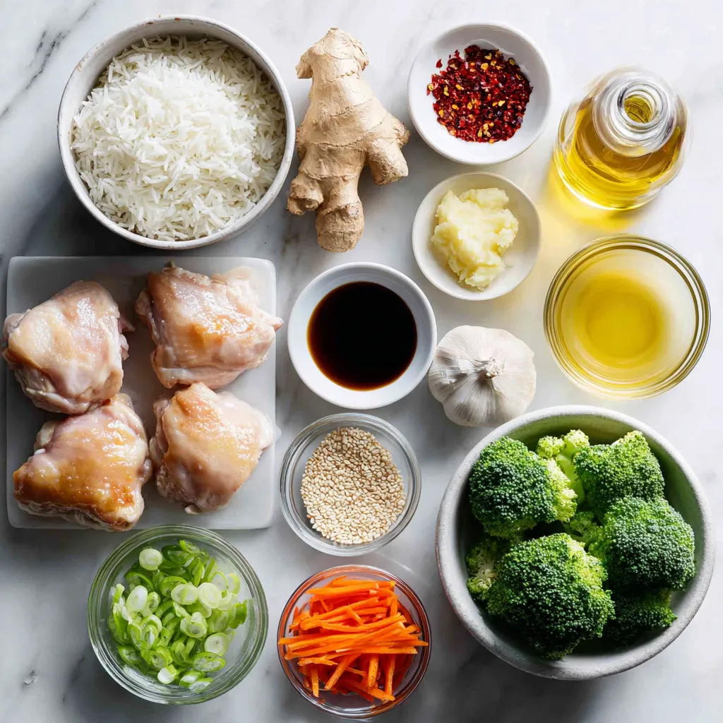 Diese Zutaten bilden die Basis für dein Gericht. Der Jasminreis sorgt für eine duftende Grundlage, während das Hähnchen die Hauptproteinquelle ist.