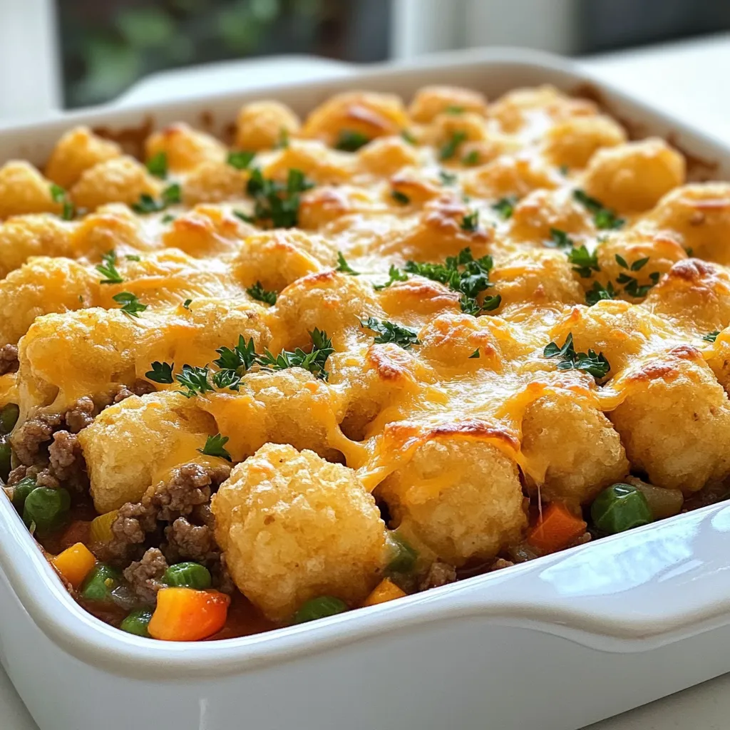 Ein herzhafter Auflauf mit Rinderhackfleisch, Gemüse und knusprigen Tater Tots.