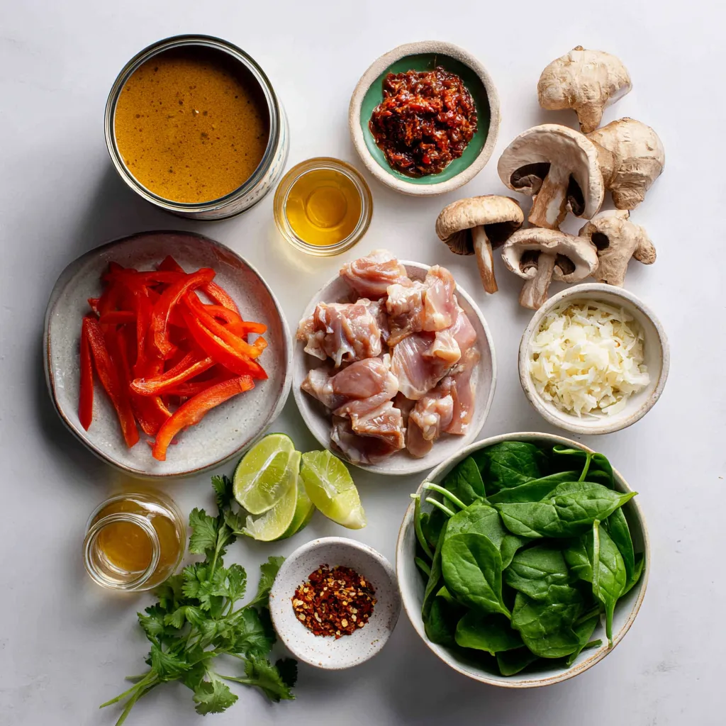 Die Hauptzutaten bilden die Basis für die Suppe. Das Hähnchen bringt Proteine und einen herzhaften Geschmack. Die Kokosmilch macht die Suppe cremig und reichhaltig. Die Hühnerbrühe verstärkt den Geschmack und sorgt für Tiefe.