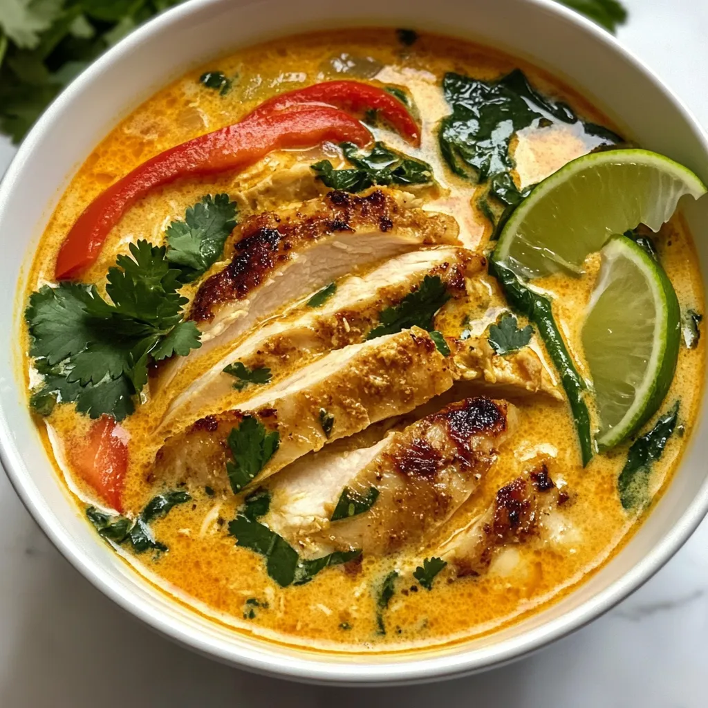Eine aromatische Suppe mit Hähnchen, Kokosmilch und frischem Gemüse.
