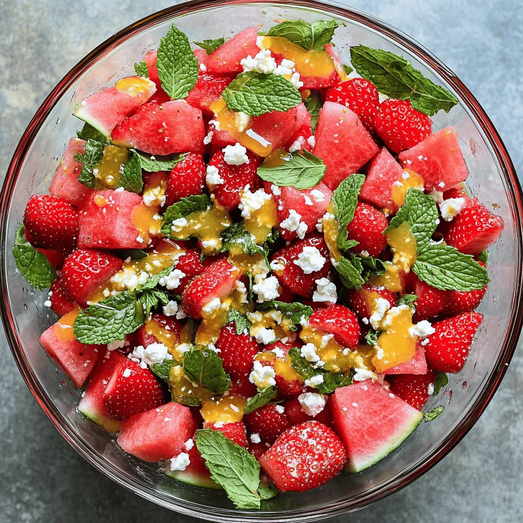Sie können die Früchte einen Tag vorher vorbereiten. Schneiden Sie die Wassermelone und Erdbeeren und bewahren Sie sie im Kühlschrank auf. Mischen Sie das Dressing erst kurz vor dem Servieren. So bleibt alles frisch und knackig. Wenn Sie den Salat frühzeitig zubereiten, sparen Sie Zeit an Ihrem Serviertag.