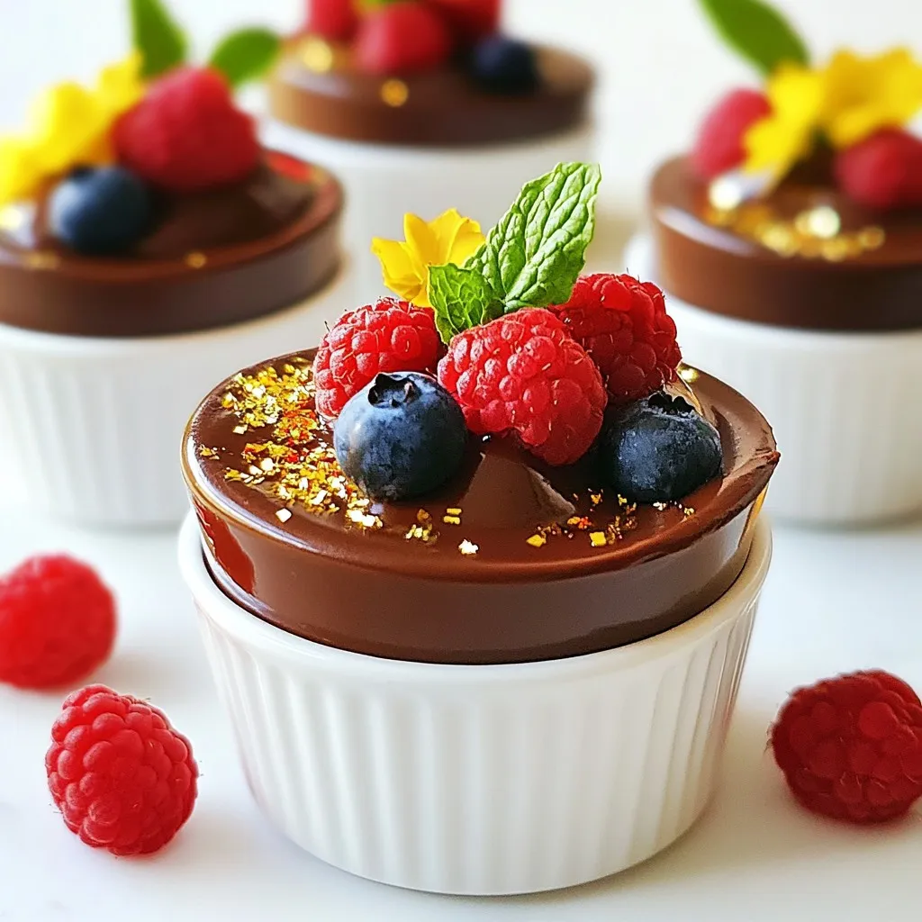 Essbares Goldglitzer bringt einen Hauch von Luxus. Es sieht toll aus und macht die Becher festlich. Frische Beeren fügen Farbe und Frische hinzu. Minzblätter bringen einen erfrischenden Kontrast zur Schokolade. Diese Dekorationselemente machen die Mousse zu einem echten Hingucker.